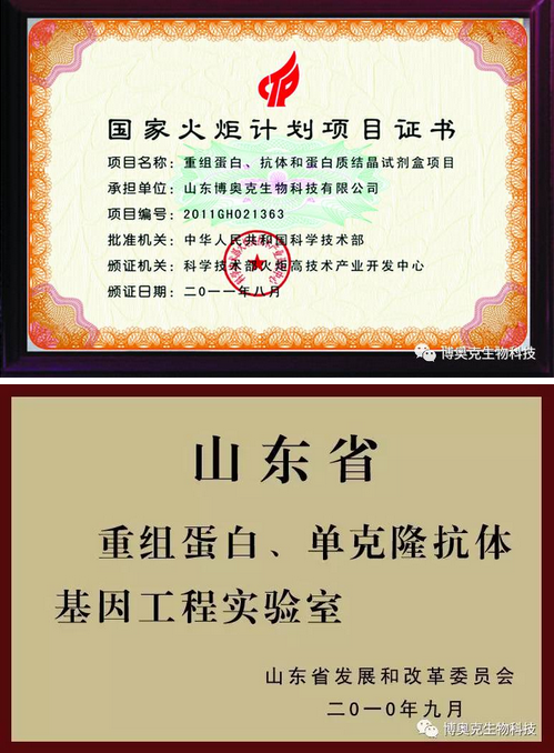 博奧克生物公司成立6年以來的努力得到了社會(huì)各界的認(rèn)可,獲得了諸多榮譽(yù),先后被授予“國家火炬計(jì)劃項(xiàng)目承擔(dān)企業(yè)”、“山東省高新技術(shù)企業(yè)”,并成為“中國生物工程學(xué)會(huì)常務(wù)理事單位”、“中國保健協(xié)會(huì)理事單位”、“中國檢驗(yàn)檢測檢疫學(xué)會(huì)常務(wù)理事單位”,2013年被國家人力資源和社會(huì)保障部批準(zhǔn)設(shè)立博士后科研工作站。公司研發(fā)中心作為中科院聯(lián)合研發(fā)中心,還被認(rèn)定為“山東省一企一技術(shù)研發(fā)中心”、“山東省重組蛋白、單克隆抗體基因工程實(shí)驗(yàn)室”,2015年12月被國家發(fā)改委認(rèn)定為“重組蛋白基因檢測技術(shù)國家地方聯(lián)合工程實(shí)驗(yàn)室”。
