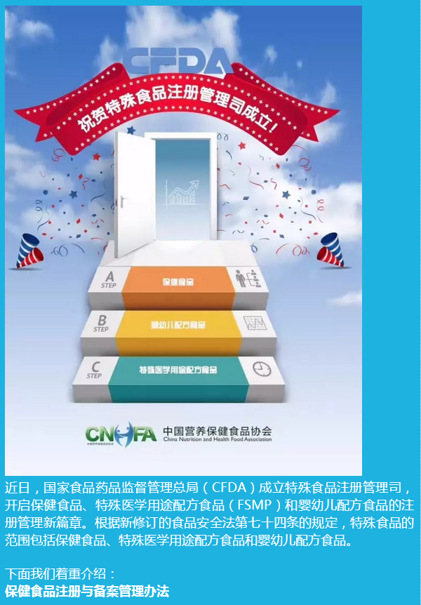 近日,國家食品藥品監(jiān)督管理總局(CFDA)成立特殊食品注冊管理司,開啟保健食品、特殊醫(yī)學用途配方食品(FSMP)和嬰幼兒配方食品的注冊管理新篇章。根據(jù)新修訂的食品安全法第七十四條的規(guī)定,特殊食品的范圍包括保健食品、特殊醫(yī)學用途配方食品和嬰幼兒配方食品。