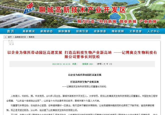2013年,公司經過三年長足發(fā)展,已經成為以研制高新生物產品為主,集研發(fā)、生產、銷售為一體的綜合性高新技術企業(yè)。而且以其為龍頭,在聊城高新技術產業(yè)開發(fā)區(qū)成立了生物科技產業(yè)園,為聊城市的發(fā)展作出了突出貢獻。