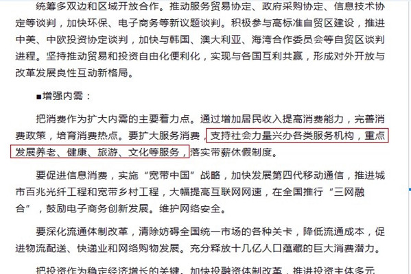 2014年3月5日,李克強總理在十二屆全國人大二次會議上的《政府工作報告》中提出:“支持社會力量興辦各類服務(wù)機構(gòu),重點發(fā)展養(yǎng)老、健康、旅游、文化等服務(wù)。”