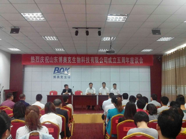 2015年5月18日,山東博奧克生物科技有限公司成立5周年座談會(huì)在公司會(huì)展中心2樓召開。董事長(zhǎng)劉欽松和公司全體員工一起座談,回顧過去五年的歷程、展望下一個(gè)新的五年計(jì)劃。